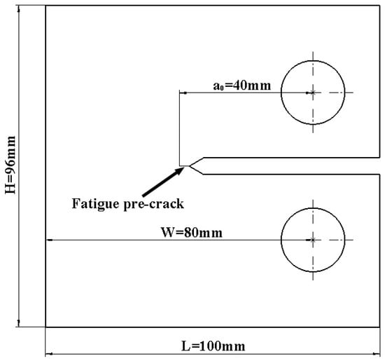 Fracture toughness evaluation was performed with ISO 12135 [23], using standard compact tension (CT) specimens (W/B = 2, a0/W = 0.5). The specific dimensions of B = 40 mm specimens are shown in Figure 3. The fracture toughness test was conducted using the same system as tensile tests, with experimental temperatures of 20 °C, −20 °C, −40 °C, −60 °C, −80 °C, −100 °C, and −120 °C. Displacement-controlled loading with 0.025 mm/s was maintained as a quasi-static condition. After breaking, the specimens were removed from the cryostat as soon as possible, and the fracture surface was dried immediately to ensure it would not be corroded.