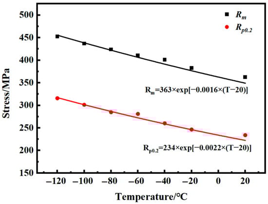From Figure 5, it can be seen that both coefficients are negative, indicating that the ultimate tensile strength and yield strength of NCI increased with decreasing temperature. These established temperature–strength correlations enable the reliable prediction of NCI’s mechanical properties at different temperatures.