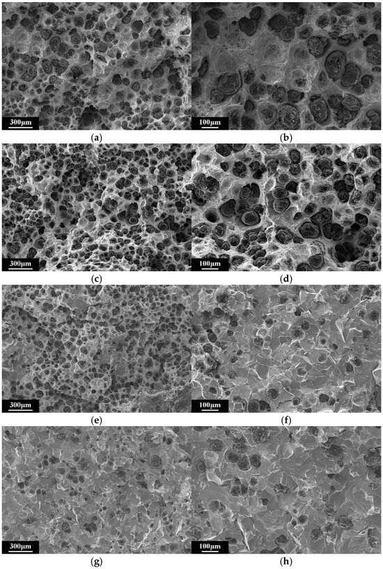 Microscopic surfaces of tensile specimens at different temperatures: (a,b) room temperature; (c,d) −40 °C; (e,f) −80 °C; and (g,h) −120 °C.