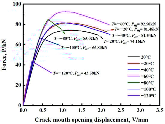 Figure 7 presents the typical loading curves obtained from CT specimens under various temperatures. Through systematic evaluation of curve morphology, three characteristic fracture regimes were identified: (a) no fracture after yielding (−40 °C to 20 °C), (b) fracture after obvious yielding (−60 °C and −80 °C), and (c) fracture before yielding (−100 °C and −120 °C).