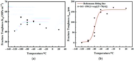 Based on Figure 8b, the whole temperature range can be divided into three parts: the upper shelf region (above −60 °C), the transition region (−60 °C to −100 °C), and the lower shelf region (below −100 °C). In the upper shelf and lower shelf regions, there were no significant changes in fracture toughness δmax, while in the transition zone, δmax changed dramatically with temperature and exhibited significant dispersion at the same temperature. The solid line in Figure 8b is the fitted curve of the values at different temperatures, which was fitted by the Boltzmann function.