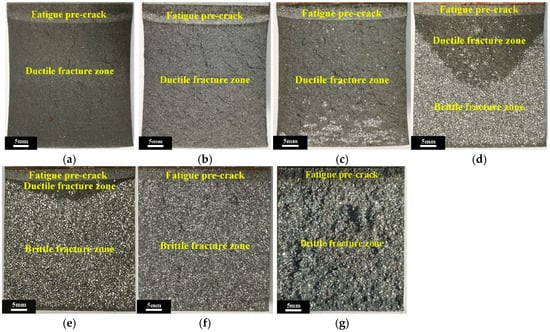 Macroscopic surface of CT specimens at different temperatures: (a) room temperature; (b) −20 °C; (c) −40 °C; (d) −60 °C; (e) −80 °C; (f) −100 °C; (g) −120 °C.
