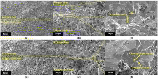 When approaching the lower shelf temperature (−100 °C), specimens exhibit a complete cleavage fracture surface. From Figure 11e, it can be seen that the dimple morphology almost completely disappeared in the fracture zone. The ferrite matrix at the tip of the pre-crack hardly underwent plastic deformation. In Figure 11d, the cleavage initiation site is directly connected to the fatigue crack tip, indicating that the cleavage crack immediately expanded once it nucleated.