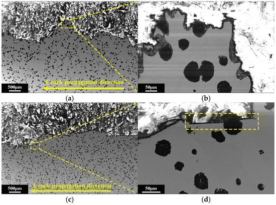 To investigate the fracture mechanism in different temperature regions, the microscopic surface was observed by SEM. Figure 10 presents the fracture morphology of CT specimens in the upper shelf region. Low-magnification images (Figure 10a,c) reveal a distinct morphological contrast between the fatigue pre-crack zone and fracture zone. The fatigue crack zone displays relatively planar fracture surfaces with characteristic river patterns, indicative of stable crack growth under cyclic loading. While in the fracture zone, extensive plastic deformation of the ferritic matrix surrounding graphite nodules is evident, manifested as ductile dimples interconnected by micro-void coalescence (Figure 10b). Dimples and tearing ridges confirm the dominance of ductile fracture mechanisms at room temperature. Additionally, interfacial decohesion between graphite nodules and metallic matrix was observed. When the temperature dropped to −40 °C, small cleavage planes appeared in multiple areas of the fracture zone (Figure 10c,d). This demonstrates a transition from ductile fracture to brittle fracture in some fracture areas.