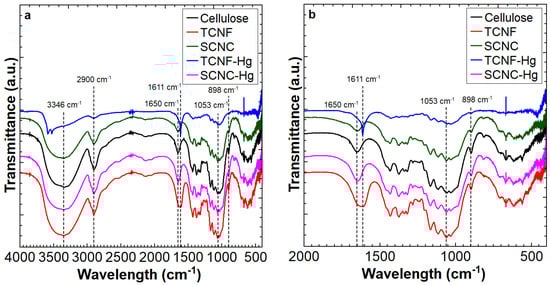 FT-IR spectra of cellulose, SCNC, and TCNF samples (a), and the detailed region between 2000 and 400 cm−1 (b).