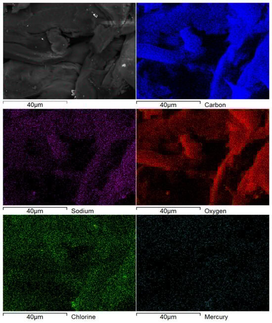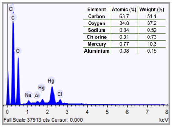 It should also be pointed out that the low mercury concentration evidenced by the EDS signal can be explained by the lixiviation of part of the adsorbed metal during the washing cycles. Finally, the bright particles depicted in the SEM image in Figure 2 could be associated with some residual presence of the reaction media (inefficient centrifugation and washing), resulting in the formation of HgCl2 and or NaCl crystals.