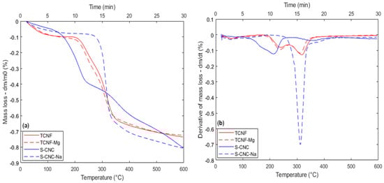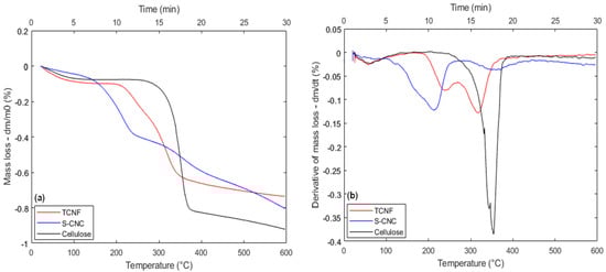 In Figure 6, both the TGA signal (Figure 6a) and associated DTG curves (Figure 6b) are depicted for pure cellulose and the two nanocellulose samples synthesized (SCNC and TCNF). According to the data, thermal decomposition of cellulose occurs at around 260 °C, which is in accordance with previous results from the literature. In the case of cellulose extracted from maize straw, for example, degradation should start at a temperature around 250 °C in N2) atmosphere (5 °C·min−1) [], 275 °C in air atmosphere (4 °C·min−1) for softwood bleached Kraft cellulose [], and 280 °C in N2) atmosphere (10 °C·min−1) for rice straw cellulose [].
