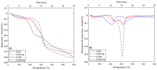 In contrast to TCNF, SCNC presents a huge difference in thermal behavior after the adsorption of mercury. The associated DTG signal clearly shows that in the presence of mercury cations, the SCNC nanofibers should now decompose in three consecutive thermal events, the first one starting at a higher temperature (210 °C) in comparison to the first DTG peak of SCNC before metal incorporation. Also, the peak intensity appears to be of much lower intensity in the presence of mercury as compared to the one found in the sample without the metal. The third peak, which, as was said before, in the case of the SCNC sample, should be related to the non-functionalized part, has almost the same intensity and shape as compared with the condition before metal adsorption. This is consistent with the expectation that mercury should preferentially adsorb in regions where -O3SOH groups had been previously inserted. Finally, between the two mentioned thermal events, a new one is observed, with a maximum DTG peak intensity of around 305 °C. This last DTG peak strongly suggests that in the case of SCNC, the presence of mercury can indeed induce a change in the mechanism associated with the thermal degradation of the nanofibers. The possible change in the degradation mechanism associated with the adsorption of specific metallic cations over nanocellulose fibers was also evidenced in the case of sodium when SCNC fibers are used as adsorbents (Figure 8a,b).