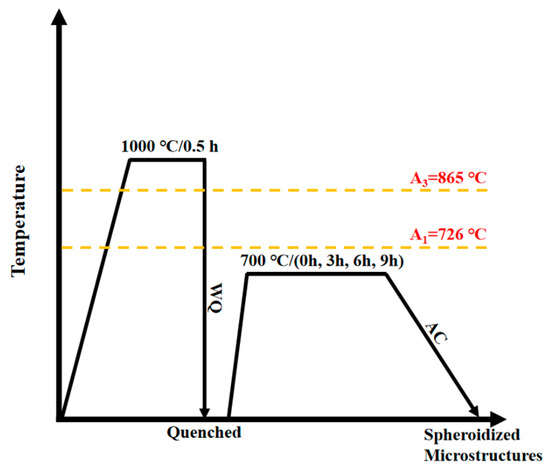In this experiment, a muffle furnace was employed to subject Q235B steel to quenching + spheroidizing annealing heat treatment, and the heat treatment process is depicted in Figure 1. According to the equations of Trzaska [31] and Park [32], the temperatures of atomic absorption spectroscopy are estimated to be approximately 726 °C and 865 °C, respectively. A1 is determined to be approximately 726 °C, and A3 is determined to be approximately 865 °C. First, the specimens were held at a temperature of 1000 °C for 0.5 h, then quenched in a 10% NaCl solution. In this experiment, the research team selected the initial fully annealed and quenched steel microstructure as the starting point for the spheroidization heat treatment study. The spheroidization heat treatment was conducted at 700 °C for durations of 1 h, 3 h, 9 h, and 24 h to observe the effect of different holding times on microstructure evolution. All experimental groups underwent the spheroidization process under a constant temperature of 700 °C. Finally, after the preliminary experiments were completed, the final test parameters were set to heating to 700 °C and holding for 0 h, 3 h, 6 h, or 9 h, followed by air cooling to room temperature, resulting in spheroidized annealed specimens.