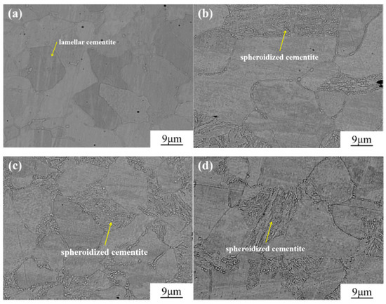 The microstructure of Q235B steel at different holding times during spheroidization annealing is shown in Figure 4. As anticipated, the fully annealed specimens (denoted as 0 h) exhibited the characteristic layered pearlite microstructure [33]. Inside the pearlite, carbides are distributed in a layered form, and at a spheroidization time of 3 h (Figure 4b), the lamellar carbides show a tendency to gradually fracture, without observing the diffusion of carbides. When the spheroidization time increased to 6 h (Figure 4c), spheroidized carbide particles began to appear in the microstructure of the pearlite, and the distribution of spherical carbides in the pearlite showed a relatively uniform state. As the spheroidization time was further extended to 9 h, as shown in Figure 4d, the shape of the spherical carbides remained basically unchanged. However, during the long-term high-temperature insulation process, the microstructure of the matrix showed an over-insulation phenomenon. The ferrite tissue undergoes growth [34].