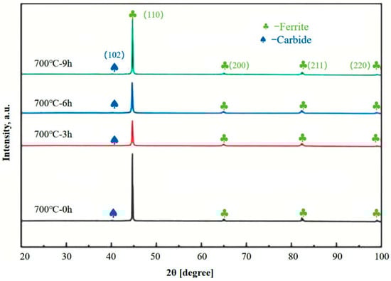 As depicted in Figure 6, the XRD spectra of Q235B steel with different holding times during spheroidizing annealing are presented. Clearly, only ferrite peaks and carbide peaks exist in the matrix, indicating that the matrix consists of these two phases. In the initial state, the XRD pattern displays distinct characteristic diffraction peaks of carbides. As the spheroidizing annealing process progresses, some lamellar carbides begin to spheroidize, leading to a certain degree of weakening in the intensity of the characteristic diffraction peaks of carbides. At this stage, the carbides are no longer sufficiently distinct to appear clearly in the XRD pattern, while the broadening of the ferrite characteristic peaks suggests either ferrite grain growth or strain accumulation at grain boundaries [41].