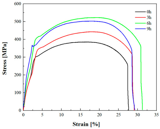 For the specimen with fully annealing holding, the tensile strength is 385.63 MPa, and the elongation is 27.66%. After 3 h of spheroidizing annealing holding, the tensile strength of the specimen is 439.81 MPa, and the elongation is 29.13%, which has increased by 14.02% and 5.31%, respectively. After 6 h of spheroidizing annealing holding, the tensile strength of the specimen is the highest, reaching 522.77 MPa, and the elongation is 31.28%, which has been increased by 35.58% and 13.08%, respectively. After 9 h of spheroidizing annealing holding, the tensile strength of the specimen slightly decreases to 503.71 MPa, while the elongation is 29.27%. However, compared with the specimen without holding treatment, its tensile strength and elongation have increased by 30.64% and 5.82%, respectively.