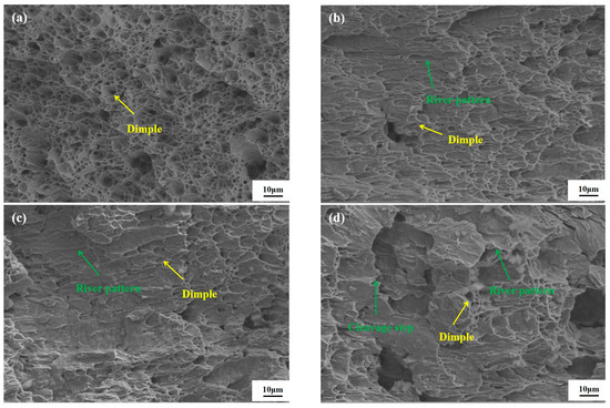 The ductile–brittle transition temperature can be evaluated through the Charpy impact test, which is the temperature corresponding to the equal area of the ductile and brittle regions on the fracture surface [46]. Based on the analysis of the fracture morphology, when the temperature drops to −20 °C, the river patterns occupy approximately half of the fracture surface, while the brittle fracture area accounts for approximately 50%. It can be inferred that the ductile–brittle transition temperature is approximately −20 °C. Therefore, when the experimental temperature is lower than the ductile–brittle transition temperature, the impact absorption energy will significantly decrease.