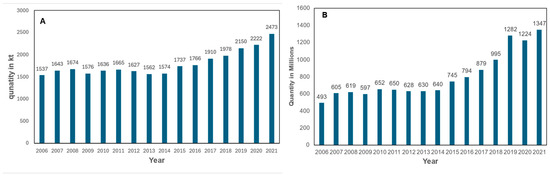 Evolution of the quantity of electronic equipment (A) and the weight in tonnes (B) from 2006 to 2021 (Reprinted form Refs. [4,5]).
