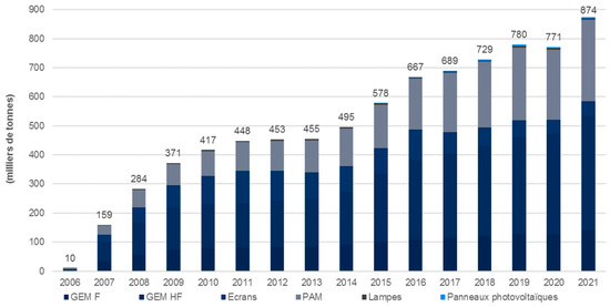 The global production of waste electrical and electronic equipment (WEEE) has nearly doubled since 2010, increasing from 33.8 million tons to approximately 62 million tons in 2022 [1,2,3]. WEEE is one of the fastest-growing waste streams, with global e-waste production expected to reach 82 million tons by 2030 [1]. China is by far the world’s largest producer of electronic waste, generating over 12 million tons in 2022 [1]. The United States followed, with approximately seven million tons produced. Global electronic waste production reached around 62 million tons in 2022 and is expected to continue increasing in the coming years [1,2,3]. In France, ADEME (French agency of ecological transition) report from 2022 on the WEEE sector in France provides a market study of electrical and electronic equipment (EEE) with all relevant organizations for the past year. This report presents key data on the WEEE sector in France (all data comes from ADEME’s 2022 annual report on EEE, based on 2021 figures): in 2021, 1.3 billion electrical and electronic devices of all categories were placed on the French market, representing a 10% increase compared to 2020. This accounted for 2,473,423 tons (+11%), equivalent to 244 times the weight of the Eiffel Tower. The following figure (Figure 1) illustrates the evolution of the total weight and number of devices placed on the market between 2006 and 2021.
