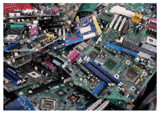 Printed circuit boards (PCBs) are substrates that interconnect various electronic components to form a functional circuit. They represent 4 to 7% of the total mass of WEEE and contain nearly 90% of the precious metals found in electronic waste [10]. PCBs are composed of the following: a non-metallic insulating polymer substrate (resin treated with flame retardants such as Br and Sb, impregnated with siliceous fibers); metallic foil layers, primarily copper and laminated layers and various electronic components. According to comparative studies in the literature, a typical PCB consists of 40% metals, 30% ceramics and glass, and 30% polymers [11,12]. The main metals present in PCBs are as follows: base metals such as copper (Cu), aluminum (Al), lead (Pb), zinc (Zn), tin (Sn), and nickel (Ni); precious metals, silver (Ag), gold (Au), and palladium (Pd). PCBs are recovered after the manual dismantling of end-of-life electronic equipment. Figure 4, Figure 5 and Figure 6 represent, respectively, photos of the investigated samples of WEEE (CRT, WTR, and PCBs).