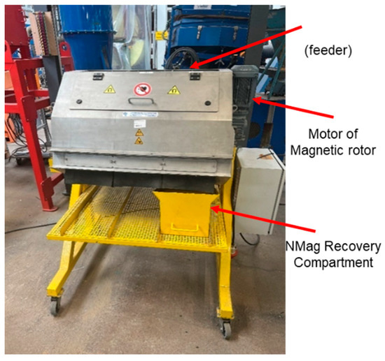 For WTR and PCB samples, we used a multipolar magnetic separator “GS magnet and separation (Longwy, France)” (Figure 7). The objective is to separate strongly magnetic particles, such as scrap metal, from other particles (copper, aluminum, lead, zinc, tin). The device consists of three drums containing Nd-type permanent magnets producing variable magnetic fields (1000, 1500, and 3000 gauss). The sample is fed from the top of the device. The ferromagnetic particles attracted by the magnetic field stick to the drum and adhere to it under the action of the magnetic force. Non-magnetic particles follow a normal fall trajectory under the action of gravity. The discharge of ferromagnetic particles occurs under the drum when they leave the field. The variable experimental parameters are the magnetic field intensity (3 possibilities), the rotation speed of the drums, and the sample casting rate, which depends on the user. The capacity of the device is several kilograms.