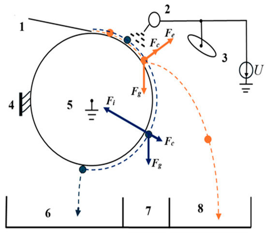 Schematic diagram of corona drum electrostatic separator (developed by Capco, Inc. New York, NY, USA) [18]. 1. vibrating chute; 2. Corona electrode 3. Static electrode 4. Brush 5. Rotating cylindrical electrode 6. Non-conductors compartment 7. Mixed compartment 8. Conductors compartment Fe: Electrostatic force. Fc: Centrifugal force. Fi: Electric image force. Fg: Gravitational force.