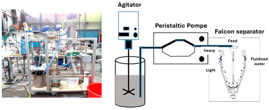 For CRT powders, this is a wet separation technique that uses centrifugal force to separate two particles of similar size based on their density. By increasing the centrifugal force, the separation of denser particles from less dense particles in a liquid medium can be accelerated [19,20]. The device used is a Falcon centrifugal density separator (Langley, Colombie-Britannique, Canada) (Figure 9). It consists of a Falcon bowl in which the particles are separated. This bowl is connected to a motor with adjustable rotation speed. A conduit evacuates the light particles, which are collected in a container. The heavier particles remain in the bowl and are collected at the end of the process. Several parameters are involved in this separation: the initial mass of the sample, the feed rate of the separator, the pulp percentage (solid/liquid ratio), and the rotation speed, expressed by the G-number. The G-number is a dimensionless unit used to express acceleration as a multiple of Earth’s gravitational acceleration, denoted g. On Earth, g has an average value of about 9.81 m/s2. The G number represents the number of times a given acceleration is equivalent to the gravitational acceleration g. The aim of this separation techniques is to concentrate dense elements such as sphalerite, yttrium and europium oxides in the case of CRT powders, and all metals in the case of WTR and PCBs in the Heavy and Sinking fractions respectively. And to concentrate light and/or floating elements such as silicates and glasses for CRT and plastics, wood, etc. for WTR and PCBs respectively.