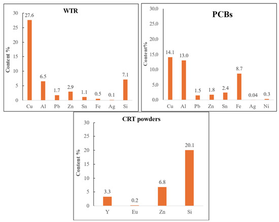 The sample collected from the WTR is very rich in metals. Figure 10 shows the initial composition of the main chemical elements contained. WTR sample contains more than 27% Cu, 7% Al, 1.7% Pb, and 1.1% Sn. However, it contains few amounts of iron (0.5%) and precious metals, with 0.1% of Ag. PCBs contain significant amounts of metals. Copper is the main one with over 14% and 13% Al. CRT powders are phosphor-containing powders derived from cathode-ray tube screens. They contain valuable elements such as rare earth oxides (Y2O3 and Eu2O3) and sphalerite (ZnS). The presence of silica (SiO2) comes from the glass of the cathode-ray tube. Figure 10 summarizes their chemical composition. From this figure, they contain more than 20% silica (glass), 7% Zn in the form of sphalerite, and more than 3% Y in the form of oxide, with Eu at 0.2%.