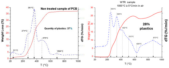Thermogravimetric analysis determines the quantity of plastic present in WTR and PCB samples; for this work, the thermal analysis used was the high volume TG/DT analysis developed by BRGM (Orléans, France). We ran this technique to observe the behavior of the investigated samples from 20 to 1000 °C under a controlled atmosphere and to quantify the plastics contained. As the samples are heterogeneous materials, we ran several grams; instead, 100 mg can be used in conventional TG/DTA analysis.