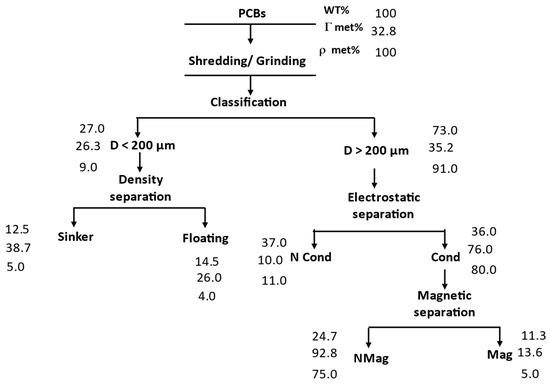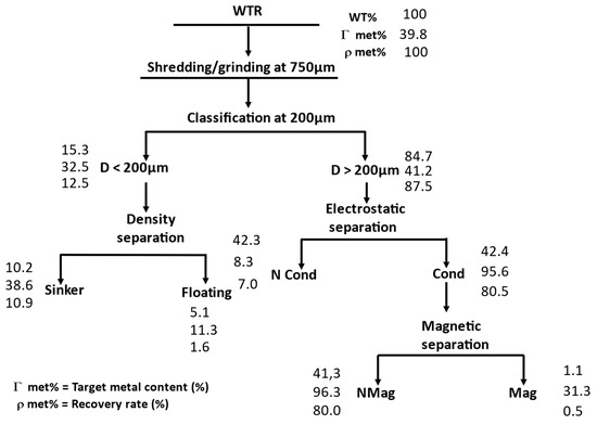 The sequence of processes applied to treat the PCB sample is identical to that used for WTRs. First, a classification at 200 µm increases the percentage of target metals from 32.8% to 35.2% in the fraction greater than 200 µm (D > 200 µm). Then, electrostatic separation further increases the concentration of target metals, reaching 76% in the conductive fraction. Magnetic separation almost completely eliminates iron, raising the concentration of target metals (Cu, Al, Pb, Zn, Sn) from 76% to about 93% in the non-magnetic fraction. An overall recovery rate of 75% of the target metals is thus achieved. Then a density separation applied to the fraction smaller than 200 µm (D < 200 µm) recovers about 5% of the target metals in the sinking fraction. The latter separation recovers the target metals lost in the fraction below 200 µm (D < 200 µm). In this way, with this treatment scheme, we recovered 80% (Figure 14) of the target metals in the two useful fractions: the non-magnetic fraction from magnetic separation and the sinking fraction from density separation, with a loss of around 20%.