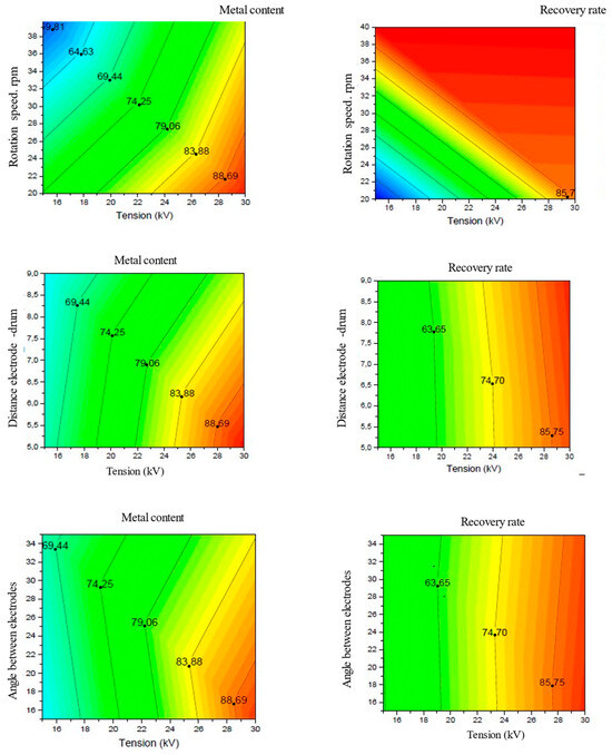 To optimize the electrostatic separation of WTRs, different parameters such as the drum rotation speed, the distance between the electrode and the drum, and the angle between the electrodes (static and ionizing) were evaluated as a function of the voltage (kV). The design of the experimental approach was taken into consideration, and the results are illustrated in Figure 13. It can be observed that at 28–30 kV and a drum rotation speed between 20 and 22 rpm, approximately 86% of the material can be recovered in the conductive fraction, accounting for 87% of the metal content. At a distance between the electrode and the drum of 5–5.5 cm and at 28 kV, the metal recovery rate is approximately 86%, with a metal content of 89%. For an angle of 17° between the electrodes and at 28 kV, the recovery rate is about 89%, with a metal content of 86%.