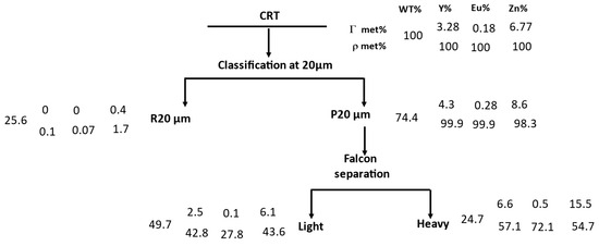 To recover the target elements contianed in the CRT powder, classification through density separation was used. The mass balance is shown in Figure 16. The fraction smaller than 20 μm (P20 μm) was subjected to density separation via centrifugation using the Falcon separator. As a result, over half of the three target elements were recovered in the heavy fraction: 54.7% of zinc and 57.1% of yttrium, along with about 72% of europium. However, silica remains present, as the current techniques are unable to effectively separate it from the other elements. While further optimization is needed to improve the recovery rates, these results demonstrate the technique’s effectiveness in concentrating the target elements.