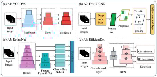 Schematic illustration of the four deep learning algorithms used in this study (Adapted from Refs. [,]). (a) YOLOv5; (b) Fast R-CNN; (c) RetinaNet; (d) EfficientDet.