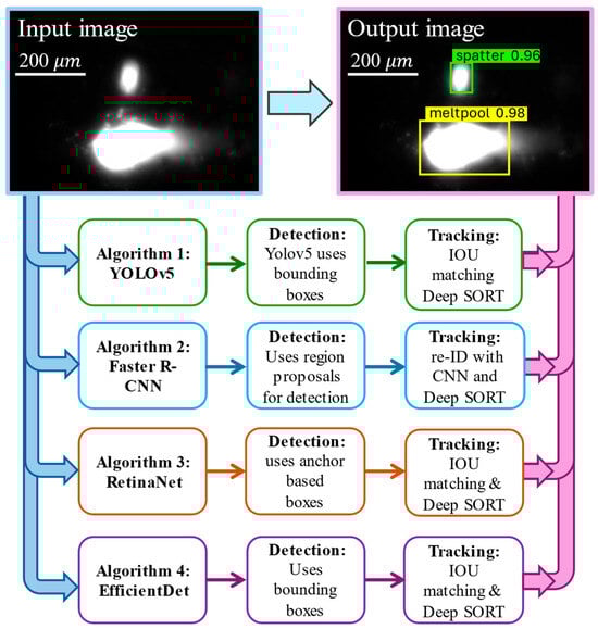 Four DL algorithms with state-of-the-art object detection architectures are applied to detect and track the melt pool and spatters using the recorded image sequences. These four algorithms are YOLOv5, Fast R-CNN, RetinaNet, and EfficientDet [,]. Here, we briefly explain and compare their structures, below and in Figure 1.