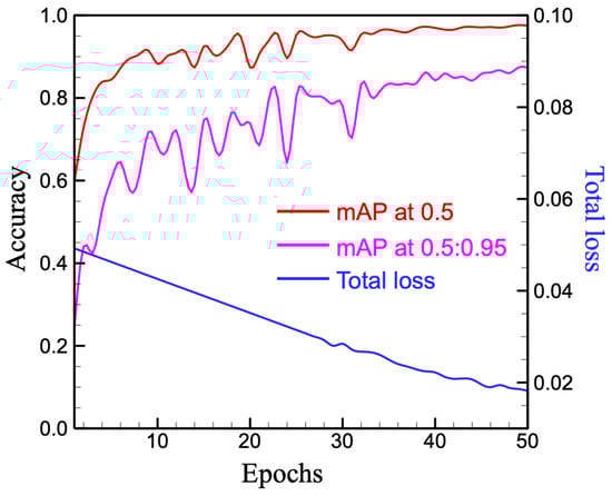 Only the well-trained algorithms are processed for the further testing stage. The training and testing time using four DL algorithms for the testing image dataset (Table 2) is available in Table 3. According to the performance of four algorithms in the training and testing datasets in Table 3, the YOLOv5 algorithm has the shortest training time with acceptable accuracy of , , and mAP values. On the other hand, the RetinaNet algorithm is preferred when the highest accuracy is desired, and more training time is allowed. The remaining two algorithms, Faster R-CNN and EfficientDet, are suboptimal.