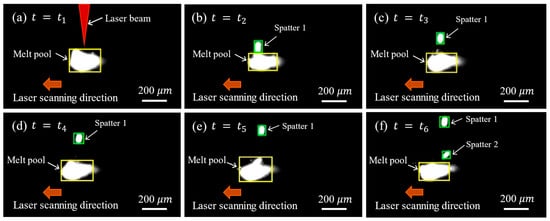These well-trained algorithms are then applied to the testing dataset to detect and track the dynamics of the spatter and melt pool over time, as exemplified by the image sequence in Figure 4. The melt pool is marked by the yellow box, while the spatters are marked by green boxes. In addition, the same spatters detected at different time steps are given the same ID number until they disappear from the image, such as the spatter shown in Figure 4b–e. Similarly, a newly detected later spatter () has a new ID number (Figure 4f). It is important to mention that, when the spatters are first detected, such as the spatter 1 at time and spatter 2 at time, their ejection speed and angle are called ‘initial ejection speed’ and ‘initial ejection angle’, respectively []. There may be some very small particles in the recorded images, which can be noise signals or tiny particles that are too small to be detected and are ignored in this work.