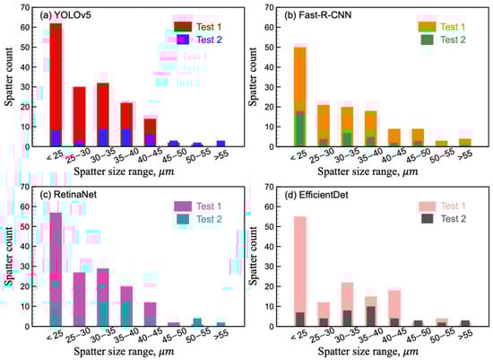 Detected spatter amount and size distribution for Tests 1 and 2 using four deep learning algorithms: (a) YOLOv5; (b) Fast-R-CNN; (c) RetinaNet; and (d) EfficientDet.