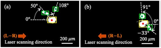 As mentioned before, when the spatters are first-time detected, such as spatter 1 at time and spatter 2 at time in Figure 4, the ejection angle is called the ‘initial ejection angle’. The initial ejection angle is defined depending on the scanning direction due to the LPBF experiments setting up as continuous linear scanning with two alternate scanning directions, left-to-right (L-R) and right-to-left (R-L), shown in Figure 6a and Figure 6b, respectively. The center locations of the spatters and melt pools are identified at different time steps. The direction is defined along the melt pool’s tail direction and through the pool center. The positive ejection angle is identified if the detected continuously moving spatter is above the melt pool region; otherwise, the ejection angle is negative. Therefore, the range of all possible initial ejection angles is [, ]. For example, some spatters and initial ejection angles are shown in Figure 6a,b. The detected initial ejection angles for all spatters in Tests 1 and 2 using four DL algorithms are plotted in Figure 7 and explained below.