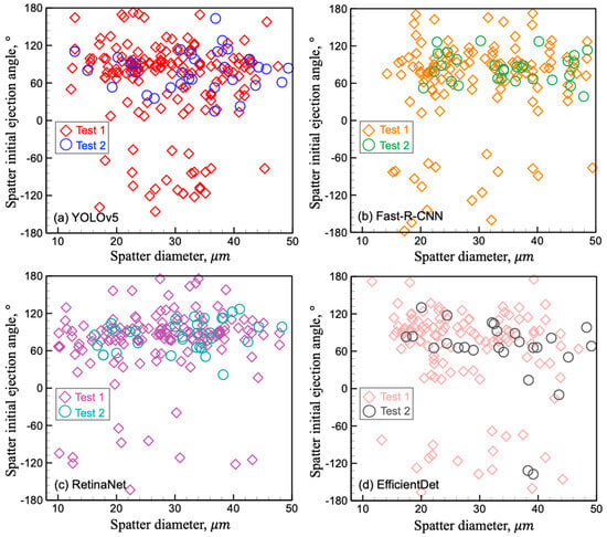 Detected spatter initial ejection angle and size distribution for Tests 1 and 2 using four algorithms: (a) YOLOv5; (b) Fast-R-CNN; (c) RetinaNet; and (d) EfficientDet.