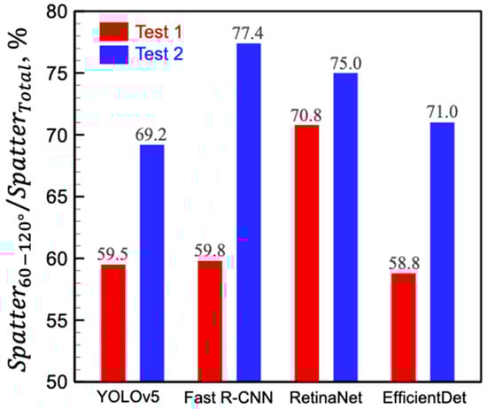 The distribution of the percentage for spatters with initial ejection angle in the range of 60–120 from the total amount of detected spatters using four deep learning algorithms for Tests 1 and 2.