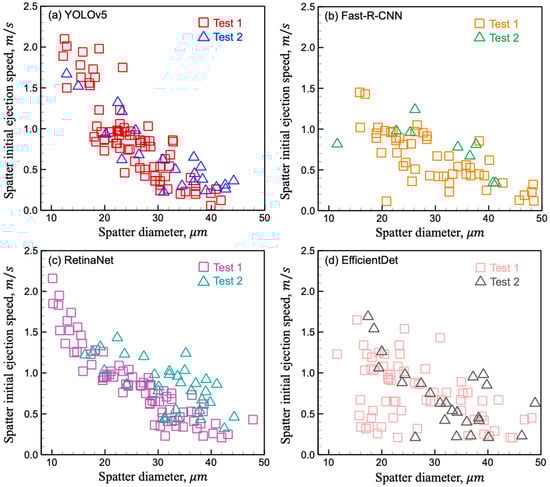 Detected spatter initial ejection speed and size distribution for Tests 1 and 2 using four deep learning algorithms: (a) YOLOv5; (b) Fast-R-CNN; (c) RetinaNet; and (d) EfficientDet.