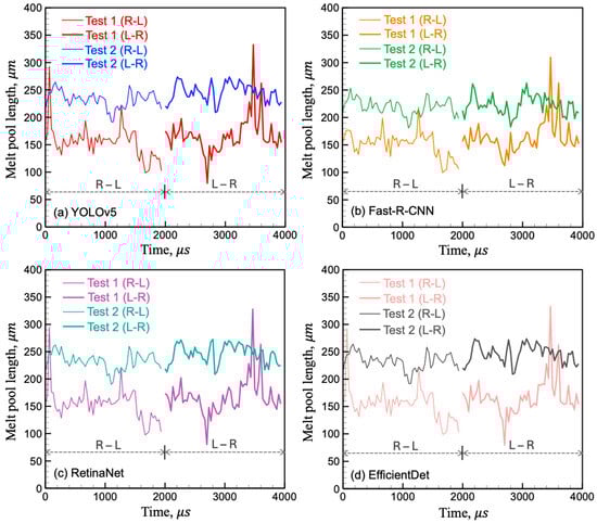 The information regarding the melt pool is extracted using the four DL algorithms, using the recorded videos for Tests 1 and 2. The detected melt pool length is plotted with recording time and shown in Figure 10. The scanning direction is right-to-left (R-L) during the recording time of 0–2000 , while the opposite scanning direction is applied (left-to-right, L-R) at the recording time of 2000–4000 , as shown in Figure 10a. All four DL methods show that the detected melt pool length of Test 2 is generally greater than that of Test 1. For both Tests 1 and 2, comparing two different scanning directions, the detected melt pool length is not a constant value due to the process instability and metal liquid fluctuation. In addition, compared to the scanning direction left to right (L-R), the detected melt pool along the scanning direction right-to-left (R-L) is more stable.