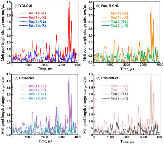 Distribution of the calculated melt pool length change rate () with time for Tests 1 and 2 using four deep learning algorithms: (a) YOLOv5; (b) Fast-R-CNN; (c) RetinaNet; and (d) EfficientDet.