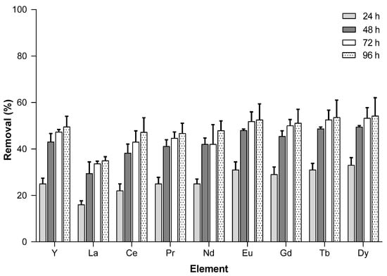 Mean bars on the central point of the BBD for the removal efficiency (%) of REEs in the mixture using the hazelnut shells (pH 6, salinity 15 g/L, and sorbent dose of 0.50 g/L). Each bar corresponds to the obtained times of exposure of 24, 48, 72, and 96 h. Error bars show the standard deviation between the replicates (n = 3).