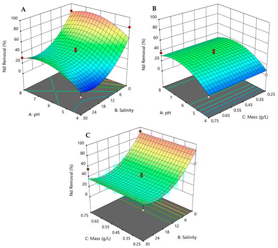 Three-dimensional response surfaces for the reduced model, considering the 3 factors for the removal of Nd from the REEs mixture by hazelnut shells at 48 h of exposure. (A) Interactive effects of pH and salinity, keeping the sorbent dosage constant; (B) Interactive effects of pH and sorbent dosage, keeping the salinity constant; (C) Interactive effects of salinity and sorbent dosage, keeping the pH constant. The bluest area represents the lowest removal, while the redest area represents the highest removal.
