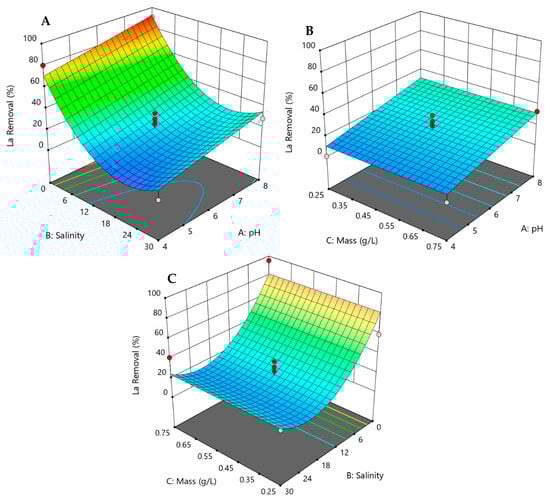 Three-dimensional response surfaces for the reduced model, considering the 3 factors for the removal of La from the REEs mixture by hazelnut shells at 48 h of exposure. (A) Interactive effects of pH and salinity, keeping the sorbent dosage constant; (B) Interactive effects of pH and sorbent dosage, keeping the salinity constant; (C) Interactive effects of salinity and sorbent dosage, keeping the pH constant. The bluest area represents the lowest removal, while the redest area represents the highest removal.