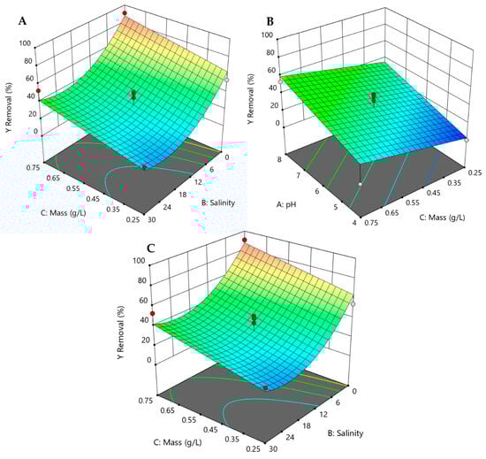 Three-dimensional response surfaces for the reduced model, considering the 3 factors for the removal of Y from the REEs mixture by hazelnut shells at 48 h of exposure. (A) Interactive effects of pH and salinity, keeping the sorbent dosage constant; (B) Interactive effects of pH and sorbent dosage, keeping the salinity constant; (C) Interactive effects of salinity and sorbent dosage, keeping the pH constant. The bluest area represents the lowest removal, while the redest area represents the highest removal.