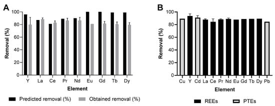 Removal (%) of REEs under (A) optimal operation conditions, comparing predicted values by the model and obtained values; (B) competing environment in the presence of PTEs.