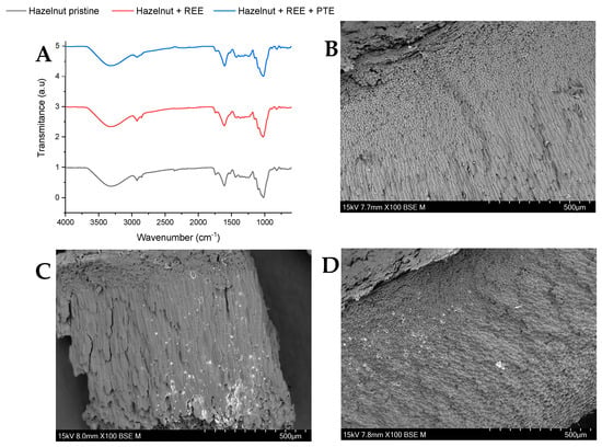 (A) FTIR spectra of hazelnut shell before (black line) and after REE (red line) and REE + PTEs (blue line) exposure; (B) SEM analysis of hazelnut shell before exposure; (C) SEM analysis after hazelnut exposure to REE solution; and (D) SEM analysis after exposure to REE + PTEs solution.