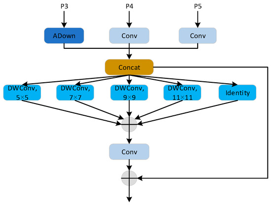 - Due to the wide variability in the shape and size of steel surface defects, this study proposed an adaptive weighted sampling (ADSConv) module. By dynamically adjusting the weighted combination of multi-scale feature maps, it enables the comprehensive capture of defect features to enhance the model’s adaptability to different types of defects.