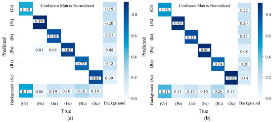 - The proposed ADP-YOLOv8-n algorithm demonstrates superior performance, achieving a favorable balance between detection accuracy, speed, and model size, with a modest sacrifice in detection speed and model size. Specifically, the ADP-YOLOv8-n algorithm achieves the highest detection accuracy in terms of Ps (84.8%), Rs (74.4%), Sc (91.3%), and mAP (79.3%). Although its detection accuracy for the Cr feature is slightly lower than that of the EfficientDet detector (53.0% vs. 56.9%), and its accuracy for the Pa feature is marginally lower than that of the SSD detector (92.5% vs. 93.5%), it still exhibits remarkable performance. In terms of detection speed, the ADP-YOLOv8-n algorithm (163.2 frames/s) is slower than YOLOv8 (209.4 frames/s) and YOLOv7 (209.0 frames/s). Regarding model size, the ADP-YOLOv8-n algorithm (9.6 MB) is slightly larger than YOLOv8 (6.2 MB), but significantly smaller than other detectors.