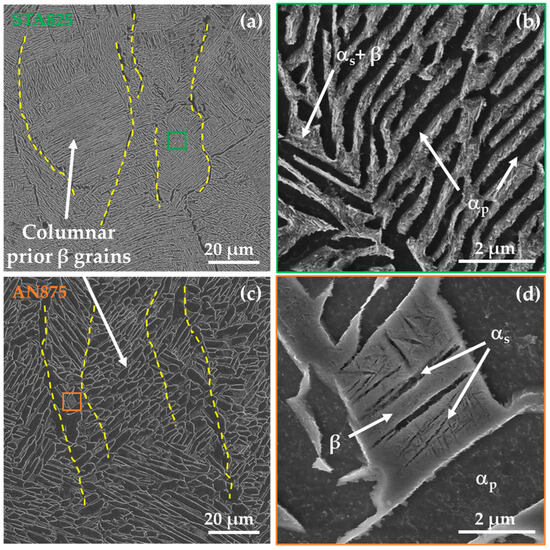 - The STA825-treated samples demonstrated the highest fatigue strength (σd,50% = 474 ± 15 MPa), corresponding to an improvement of nearly 25% over the AN875 condition. This enhancement is attributed to the presence of strengthening precipitates, the refinement of αp lamellae, and the formation of ultrafine, homogeneously distributed secondary α lamellae within the β phase (αs + β), which hinder fatigue crack nucleation and early-stage propagation.