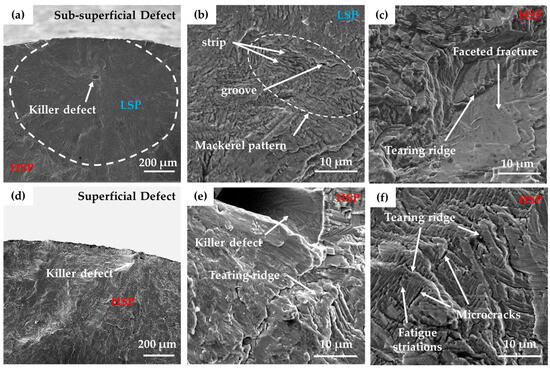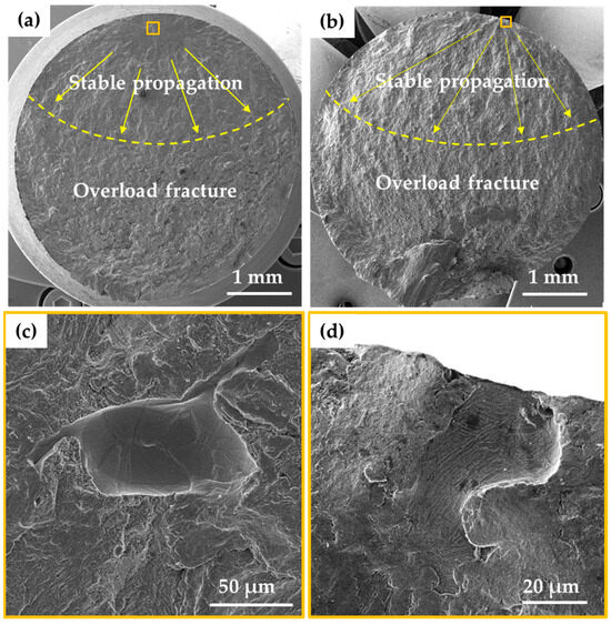 - Crack propagation behavior was strongly influenced by defect location. Subsurface defects triggered an initial low-speed propagation (LSP) region characterized by a “mackerel pattern”, likely due to the high microcrack growth resistance in the early propagation stage at αp/(αs + β) interfaces. This was followed by a high-speed propagation (HSP) region exhibiting quasi-cleavage fracture. In contrast, surface-initiated cracks propagated directly through quasi-cleavage mechanisms from the crack tip. Fatigue striations were observed in the HSP zone.