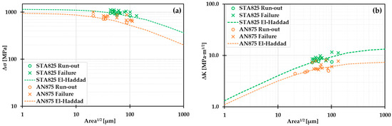 - El-Haddad’s best-fit parameters derived from the Kitagawa–Takahashi diagrams confirmed the beneficial role of the fine bilamellar microstructure of the STA825 condition in enhancing fatigue performance, with an increase of 19% in the intrinsic fatigue limit (Δσth,0) and 77% in the threshold stress intensity factor (ΔKth,lc).